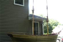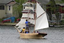 Since this picture of Little Leon, two staysails have been set between the two masts but I still have to make the fore course, the lowest square sail. We’ve had Little Leon out four times since this picture was taken but everyone who comes is in the boat so we have no new pictures! The fore course will be made this winter for the 2009 sailing season and we’ll get some pictures with her full suit of sails. One person can sail with all 7 fore-aft sails and one other person is needed to set the square sails.