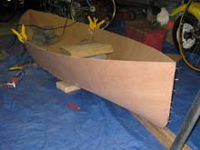 has a bit more "V" than I wanted but I feared any more twisting would have torn the panels. Although Larry used 4mm in his canoe and experienced only minor tearing of the plywood, I would not attempt to build this boat out of plywood thicker than that.