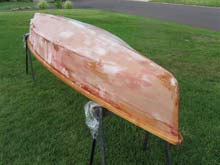 entire outside of the boat with 4 oz fiberglass cloth, with a 3 inch fiberglass tape added along the keel. The inside is merely coated with diluted epoxy while the interior seams have a single