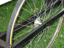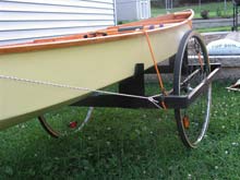 build a "dolly' of sorts that fastened to the canoe, and a "tow bar" that clamped to the thwarts of the canoe and hitched to the seatpost of the bicycle. My trailer design borrowed heavily from some bicycle utility trailer designs which I found on the web. The 27 inch wheels came from an old Schwinn Varsity 10 speed which I had orignally purchased in order to get fenders for another old Schwinn that I use as a commuter bicycle. The frame of the dolly is wood, glued together with epoxy, while the "drop-outs", or brackets that the wheels bolt to, where fashioned