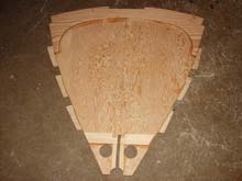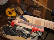 In no time I had a complete parts kit. 2 sheets of plywood used not including Transom. To make sure my port side and left side frame members matched, I clamped them together and sanded them on my belt sander. The belt sander was clamped to a work table to make things easier. |