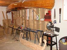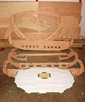 | With the success of the first two frames, the other frames came quickly. Within a couple of weeks I had made a frame kit. However I had no transom yet. I intended on having a fancy bright varnished transom so I searched many of the local lumber yards looking for that perfect piece. Nothing. I searched again another day for a nice piece that would do the job but need some work. Nothing. Finally I went to the closest lumber yard and picked up a thick piece of ply surrounded by a host of other mediocre lumber. It would have to do. It was unceremoniously brought home on the roof of my car and cut to the shape intended for a transom. |