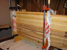 I set up a jig made from old cupboard doors (A story for another time) to hold the strips of wood in place. This would help me clamp and align the pieces better. The strips were coated on one side and placed in the jig. Once all the strips were in, I lightly clamped the whole thing until the glue set. The same procedure was used for the rudder blade. |