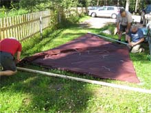 | Bending the 115 ft sq NormsBoat sail brought from the US onto the spars - a wooden boom and a piece of Laser lower mast section of aluminum. |