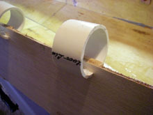 I decided to use Epoxy during the construction, with the “cure” time of epoxy being a lot longer than glue I needed more clamps. I cut some 2 ½ inch PVC pipe into short pieces. These make good clamps for clamping thin wood that doesn’t need a lot of pressure.