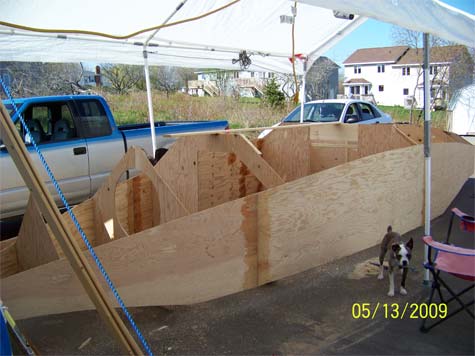 The actual construction has officially started. I've attached a picture for you. I built all the bulkheads and side/bilge panels a month or so ago so today I just started putting it all together. Tomorrow I'll finish the bevels on the bulkheads and get it all on center and then epoxy the BH's to the side panels. Friday is calling for rain so I'll attach the bilge panels on Saturday and maybe even start on the bottom. I plan to completely finish the bottom (paint and all) before rolling her over.