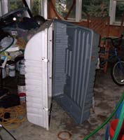 On the way to work one morning I saw that someone had discarded a Sears Xcargo car rooftop carrier and thought that the top half would make a nice hull. I paid the neighbors $2 to let me hide it under their porch just as the trash truck arrived. To make it into a boat required only installing pine gunwales to tie the rope oarlocks to, and the addition of some foam flotation, although the fiberglass it's made of barely floats naturally. For a seat, I throw a flotation cushion in the bottom. It is a bit more flexible than I'm used to, but it only weighs 17 pounds. It is about 4' X 3' X 1'. The following two images show it in a very restricted part of Four Mile Run, something I can do after work without driving ten miles in rush hour traffic to the river.