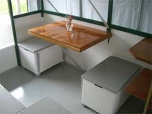 You really want to read Tom David's blog about building a Bolger Cabin Clam Skiff that he calls Grinder. He does some things with the interior to make this relatively tiny boat liveable.