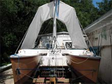 Folks here might be interested in a couple modest improvements I've recently added to Slider-- a deck tent and a cockpit table/cooking surface.