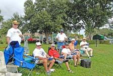 Bob Seiden can be credited with having introduced my `windling’ model sailing concept to America in the United States I’d say, the Kings Point Model Yacht Club in Florida of which he is Commodore and `Chief driving force among the snowbird sailing members having adopted it several months. What is windling ? Well it can be anything you want in the line of non-competitive or even vaguely race oriented. Sail around the lake over an agreed course as a fleet while you enjoy your `cruise’ and if you miss a buoy so what – look upwards, the sky is still there and nobody has stolen your trusers so what’s the big deal! There is no prize, and chat with your fellow skippers as you all walk together and follow the boats, or set a tight course (or no course at all and `sit and sail’ as the KPMYC group is seen doing, even take a break with the Solings parked in the shallows as the other picture shows.