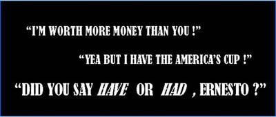 Let us end this one with a laugh since many among us have forgotten how to laugh. Even Larry and Ernesto don’t appear to laugh much these days, they are too engrossed in hurling of allegations and insults at each other and counting their big `spends’ on giant multihulls while together (in my opinion) they successfully stuff up the concept of the America's Cup. Retained lawyers, advisors and boatbuilders must be laughing though... all the way out from a continuous jungle of court rooms and hearings to their respective banks! Anyway, maybe the event will return