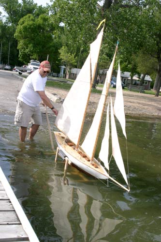 Obtaining plans from the Hart Nautical Library Kenneth’s build of the 102” replica of the famous schooner was to take him most of four Winters and one whole Summer, the boat’s first launch taking place in Lake Manawa in Iowa. He built the hull cedar planked on marine plywood frames, deck out of sprung poplar, the keel of mahogany, deadwood deck houses and the spars of spruce.