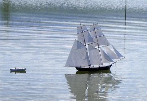 In the photograph immediately above is the schooner with the smaller sail and in both photos she is towing a Styrofoam whaleboat as a marker buoy with twenty feet of kite string on a spool in case the model should ever sink.