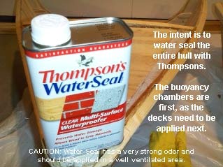 Much of the change in design is an outgrowth of the newer boats I have recently designed and built. I have settled in on a construction method that pretty much forms the hull shape without fancy forms or complicated dimensioning. The bolt-together modules seem to be what builders prefer, and small decks provide necessary dry storage areas. Also, I am now recommending that the entire hull, inside and out, be treated with Thompsons waterproofing prior to finishing. This is a direct result of not being able to easily secure quality plywood. My most recent boat was built with inexpensive ACX plywood, treated this way, and after a few excursions to the lake, has proven to be very water resistant. However, as with most of my designs, fiberglassing the exterior is always an option. This would produce a craft that was capable of much rougher waters, as opposed to the recommended calmer ponds and lakes of the plywood only versions.