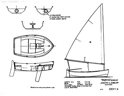 Pepita is a lightweight, 7'3" dinghy with a 3' l0“ beam designed by loseph C. Dobler, 801 Eighth St., Manhattan Beach,