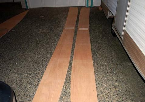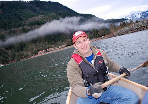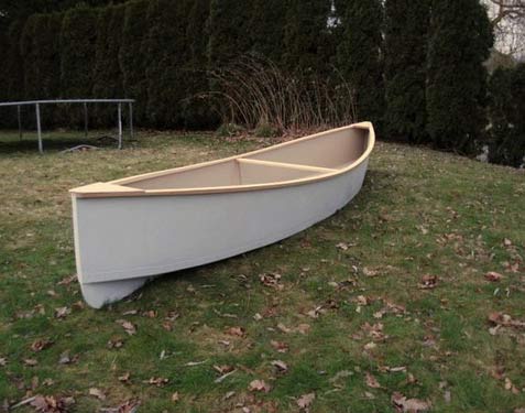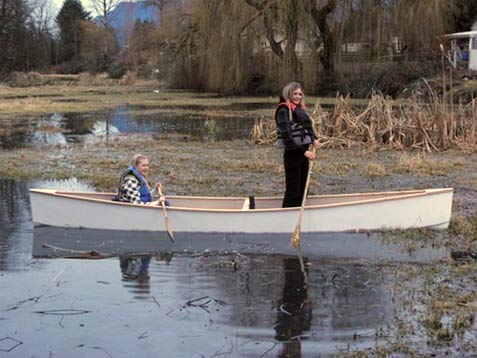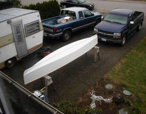 Rick is kneeling in the boat while he works out whether he will trim the skegs for faster turning and just where he will put the seats. The plans say where, but he's done a lot of canoeing so he is working it out to suit himself.