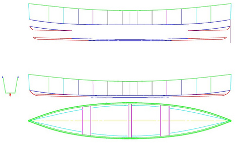 You can see how the skeg melds into the hullshape to produce the appearance (and some of the handling) of the traditional canoe. Rick was working with cheap materials - three sheets of exterior ply, PLPremium glue, Glass tape and Polyester Resin. Anyone who knows my normal plans will know that I am a stickler for quality materials - epoxy and marine plywood.