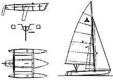 The trimaran combines a single line hull, to carry the load, with a smaller hull on each side to provide the stability. The wind pushes on the sails and the trimaran resists the heeling force by transferring some ofits weight to the lee float, which can then push up with a force equal to the weight applied to it. This is in accord with the ancient law that water pushes upward on a vessel with a force equal to the weight of the water displaced by the vessel. The float is shorter than the main hull and if it is canoe shaped or V-bottom design, its resistance to forward movement will increase rapidly with increased load, approaching a hull speed which will be lower than that of the main hull. Obviously this is not good, we expect to go faster, not slower, when the wind blows harder. What to do?