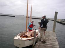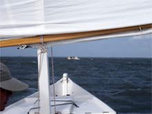 We met Bill, Chuck, and Stuart at the rendezvous, quickly secured the boats, and anxiously scanned the horizon. We saw Pete in his Nordic 16, Jester, sail by under jib alone, going we knew not where as we had no means of communication. While we waited, we wondered if David had been able to start his motor. “What side did the boat land on?” “Starboard, the side with the leeboard.” “Going over on the starboard side is good, the outboard on a Mikesboat is mounted on the port side. The engine would have been out of the water. How high was she floating?” “Very high. I don't think she was down more than a couple inches – almost all of her starboard seating was exposed.” “OK, good, I wonder what's keeping them?” What was keeping them was that they were playing it safe and keeping their speed at a reasonable four miles per hour. We soon spied their masts, then their hull as they approached over the curve of the earth, and minutes later, they were at safe harbor at Calico Jack's (a small harbor with a ramp and tiny store) on Harker's Island.