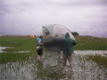 Through my tiny, dripping, tooth-rimmed, slit of a window on the world, I watched as the sky went from black and streaked with lightning to gray and streaked with lightning. Over the intervening – and sleepless - 14 hours, I had developed a perfect plan. Finally, at 8:30 am, well after dawn and still with no signs of life from the rest of the company, I slopped out of my slimy, clingy, cocoon and stomped over to Paul’s tent. Comfy and dry, he looked slightly alarmed when I peered at him through the mesh and said “Here’s the plan: We call Calico Jack’s and get a water-taxi over here. The guys with cars go to Harker’s and make their way back to Cedar Point, get the trailers, drive back to Harker’s, take the ferry back here, we all sail across, and pull out.” “Um, I suppose we could do that, if that’s what the rest of the group wants . . . but the weather is supposed to get better after 8 pm tonight.” Great, another 12 hours in the wind and rain, and maybe, just maybe, the weather *might* clear. “OK, talk it through. There’s a covered pavilion at the visitor’s center by lighthouse, I’m going there to try to dry out my gear.” I spun on my heel, scooped up my sodden bedding, and tromped off, dead into the wind and rain, trying to cover the quarter mile to the pavilion before I either breathed in so much rain I drowned or the pelting drops flayed the skin from my exposed hands and face.