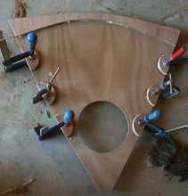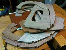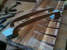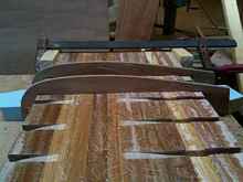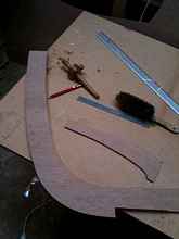 The two outer laminations have been roughly cut using the more finished centre strip as a template. The little piece of ply laying there will become a template to make the centreboard later. It is a half male template at the top and a half female template at the bottom.