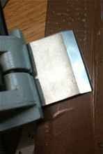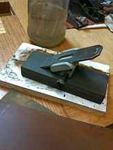 Coarse carborundum stone used to remove chip on the secondary bevel. I will produce a straight, grey flat area which will become shinier as finer stones are used.