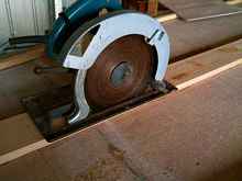 The old heavyweight is used to plunge cut along the 2 lines. The ends are cut carefully with a jigsaw, because there is framework under there and a blade hitting it end-on can give you a scare. Plunge cutting is worth practising on scrap if it intimidates you. A circular saw gives a much straighter cut than a jig saw can.