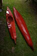 The completed boats. The yellow cedar ribs are clearly evident through the translucent nylon fabric of the right-hand boat, while the seat boards are visible through the cockpit of the left-hand boat.