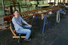 His shop is a spacious open tent made of wooden poles and rafters covered with urethane fabric – essentially the same material he uses in his boats. It is down a quiet dirt road off the side of the main road into town, around the corner from the entrance to his property and backs up to a quiet little pond enjoyed by his ducks – an altogether perfectly appropriate spot for building boats.