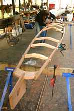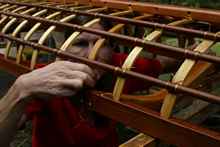 Lashing the yellow cedar ribs to the red cedar longitudinals. The lashings aren’t yet trimmed in this picture.