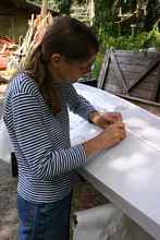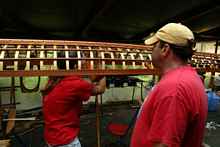 Finally, we attached stretchy black nylon cord to the exterior of the boat, which is used to secure things needed quickly by the paddler, and a nylon line around the exterior of the cockpit, used by some paddlers to attach their spray skirt, which in turn keeps water from entering the boat. Since these boats are not compartmented as are modern plastic or kevlar kayaks, float bags are placed in the bow and stern to provide reserve flotation in the event of an unexpected capsize.