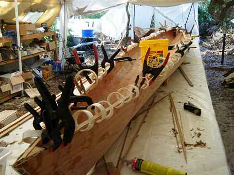 Clamps- this may be a record. Stan's putting a rail on my 20 ft kayak and there are 105 clamps of one kind or another holding it on. If you haven't seen them, these white circles are pvc pipes. They work pretty good for light holding jobs. Paul was here last week and took this one of me out in the shop.