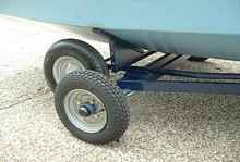 - The need to keep the main road-going trailer out of contact with sea water. Hence the piggy-back design. The launching dolly uses relatively cheap wheelbarrow wheels and a loose axle so that if corrosion does become a problem these parts can easily be replaced.