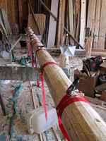 After an initial dry fitting, epoxy was liberally applied to the facing surfaces and kitchen plastic wrap used to keep from gluing the straps to the mast. Once the two halves were firmly set together the mast was much stiffer, but not fully what was hoped.