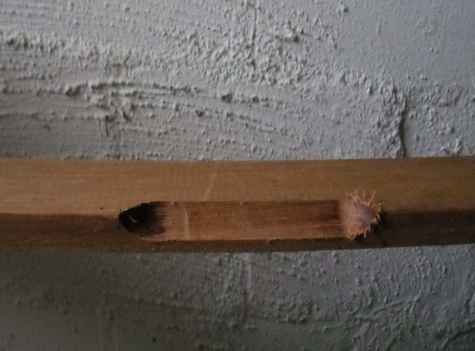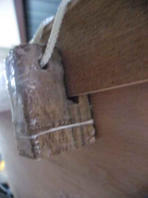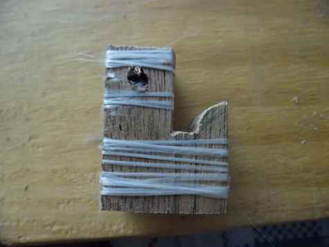 Cut the hook out. Part of the problem with wood is that it has a grain and it can split more easily along the grain than across it As a result the wooden hook needs to be reinforced across the grain. Luckily fibreglass strands abound in my workroom and picking a few inches off the end of the fibreglass ribbon provided a fibreglass thread that was quite long as the thread zigzags across the ribbon and unravels reasonably easily.