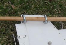 I could not find eyebolts locally to take the 1" dowel I am using but I found an eye nut that worked. I attached mine to the side of the rudder stock using 1/2" threaded rod - galvanised was the best I could get. A rope in one end and a rope grip on the other was the go I decided. The rope should stay. If not I will rough up the dowel and glue the rope to it. I used fishing rod runner binding techniques. There is a description of the tying here. It works well and you can even push the tiller back to pass behind your back on a tack and then pull it forward again.