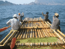The 'Rangki Papa' ('Father of all Rafts') approaching the coast of Komodo, Bali, having succeeded in crossing from Sumbawa, 7 October 2004. The vessel traveled 36.4km in 9 hours 22 minutes.