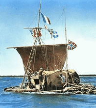 There is little doubt that rafts continued to be built and used for every possible purpose throughout the world, from the Stone Age migrations to modern historic times. A raft may have been used for the first crossing of the Pacific Ocean. Thor Heyerdahl's 1947 Kon Tiki expedition attempted to prove that early South Americans colonized Pacific islands. Using a balsa log raft, Thor and crew set sail from the Peruvian coast. After 101 days and 4,300 miles the raft arrived at Raroia in the Tuamotu islands.