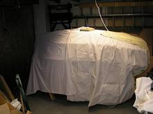 Just because we are snowed in for Christmas is no reason for the building to stop. I rigged a few dustsheets to make a warm enclosure in the unheated garage so the epoxy can cure at a good temperature, the shape of the dinghy on two trestles is ideal for this.