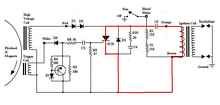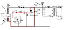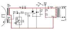 So now we have a charged up capacitor. Then the flywheel magnet passes the trigger coil. It generates the pulse that turns on the SCR. I had thought the SCR’s gate needed to go positive with respect to the cathode to turn on, but apparently a negative pulse will also do the job. However a negative pulse needs to be bigger than if it were positive. (Thanks to Mr. Clarke for pointing this out to me.)