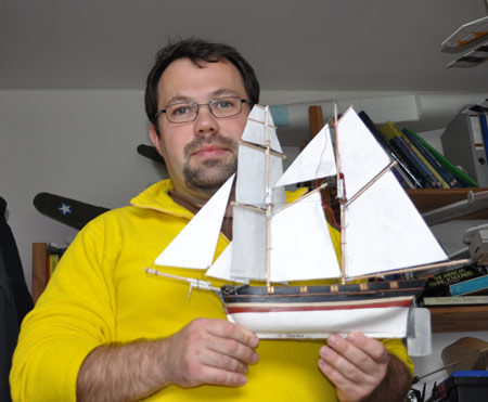 Early entrant Alistair Roach of UK with two entries, the bigger of the the two SS Great Britain and the freesail leader for some time, a 2.5" schooner Glasgow