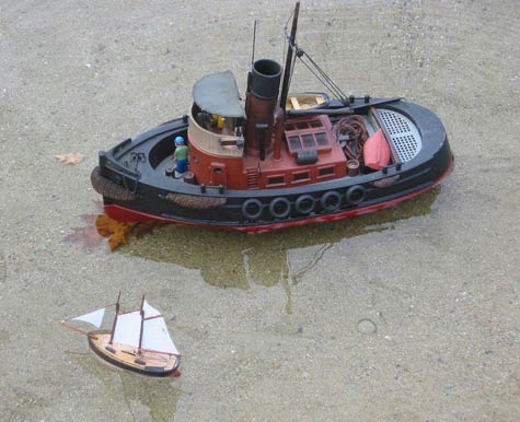 Right then – who won the principal award for the smallest RC schooner I hear you say! Well there were fewer entrants than freesail and the winner of the smallest RC schooner on Planet Earth was Hans Berger of Plainville, Connecticut fpr his topsail schooner with 3 channel RC Gypsy II with a deck measurement of 3.905 inches. Mike deLesseps of Maine in the US. For his second entry schooner Suzanne took the runner award. The boat was well thought out, a good looker and quite enchanting, I loved the photograph he took of it in the shallows with his little tug Brutus.