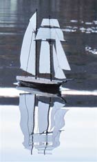 The idea for my challenge actually started while seated one wet New Zealand Winter morning on our `porcelain pony’ (well, many people get their best ideas in the loo!), that of wondering just how small a model schooner could be made to incorporate radio control. I made it as easy as possible in that the entries could be scratchbuilt or kit-adapted and aware of the ingenuity of some keen modelers, I envisaged that an eight or nine inch length on deck model would be about the limit, in other words a 12” Footy would just not be competitive. Was I surprised? Was I ever!