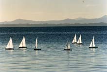 On 29th November 2005, nine Ancient Mariners with eight Footy boats and one small scale schooner assembled beside a small stream in Auckland where several `events’ were held in both directions sailing into the wind for the upward legs to a turn-around point then a downwind screamer to the finish. It mattered not who won and nobody grumbled at either `lift outs’ or `run up the bank `plonk back in’s’, nor that Dennis Lake’s pretty Argus schooner with its greater hull length and sail area invariably won.