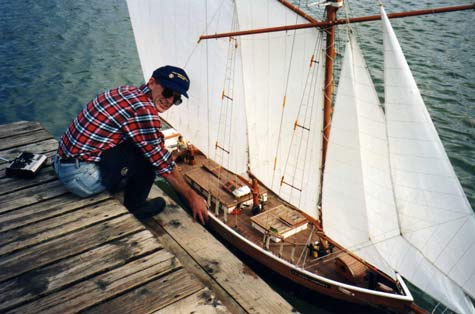 Above sails Aucklander, Keith _(will advise surname) new schooner Tomahawk, built this year by the owner simply because he `always liked schooners!’. A member of the Scale Marine Modellers, he has already built and regularly sails a Starlet with the Ancient Mariners at Onepoto lake on Auckland,