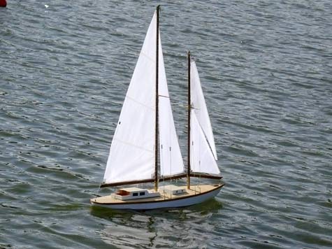 Borrowing the mould of Murray White’s sloop Scout, Keith once the hull was ready fitted frames and a 1/16 ply deck and then took measurements of its cabins and hatch of Dennis Lake’s small Argus schooner, added coamings, fitted RC gear and ended up with the schooner he named Tomahawk . When photographed it appeared to sail very well.