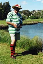 In another event after a sumptious sandwich and cake lunch while sprawled on the grass beside the stream under the trees, the `big prick’ event where yellow balloons were eliminated by boat bowsprits with pins, took place, a red haired creature, Dora Dingbat made a brief appearance while taking care not to be photographed, and I should have mentioned that funny hats and colourful shirts and socks were the order of the day.