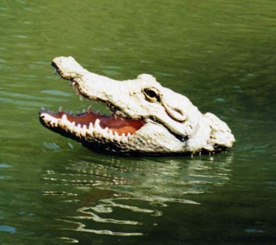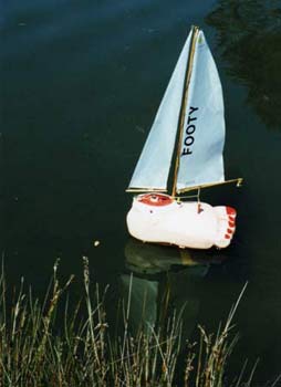 During one event several boats were suddenly confronted by a most realistic RC-controlled crocodile appearing out of the reeds on the opposite bank made by the now departed Bob Walters, and a Footy-sized foot-shaped boat took to the water amid laughter towing a giant `big toe’ (looking very much like one of mine!) made by Ron Rule.