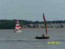 Larry Haff with his Glen-L Minuet "Sea Snail" (I nearly built one five years ago). Larry's trailer axle buckled as he arrived ... and again heading home ... "At least I got in some sailing". |