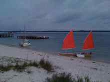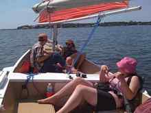5) sounded revelry and I was OFF!!!! Much clatter and banging occurred while I packed the boat and set the masts, at least I'm told so by my sleepy family! By 7am I was ready, and by 8 the rest of my family were as well, and we splashed LagunaUno about 8:15am, Thursday, May 12th. Then a fast run to the store for ice, beer, and some gas for a nice couple of ladies who thought they may need more after seeing my 5 gallons. The captain's meeting started around 9, and by 10:30 most of the fleet had set sail. A new friend was in need of a drill to repair a spreader so I hung around to help him as well as provided human bumpers for the nice ladies who we had gotten gas for earlier.